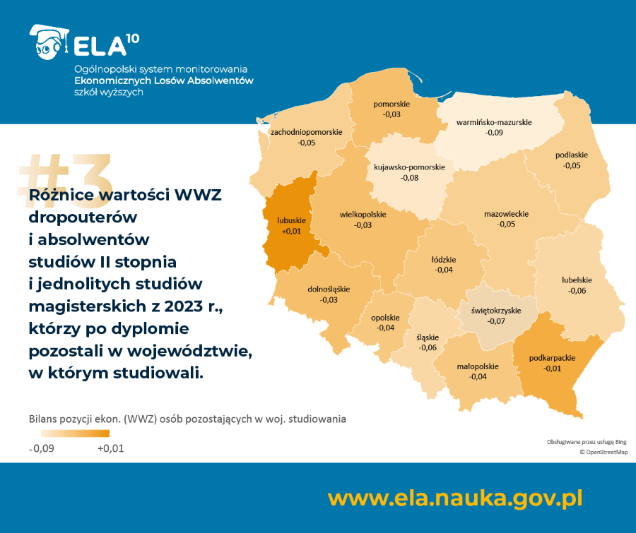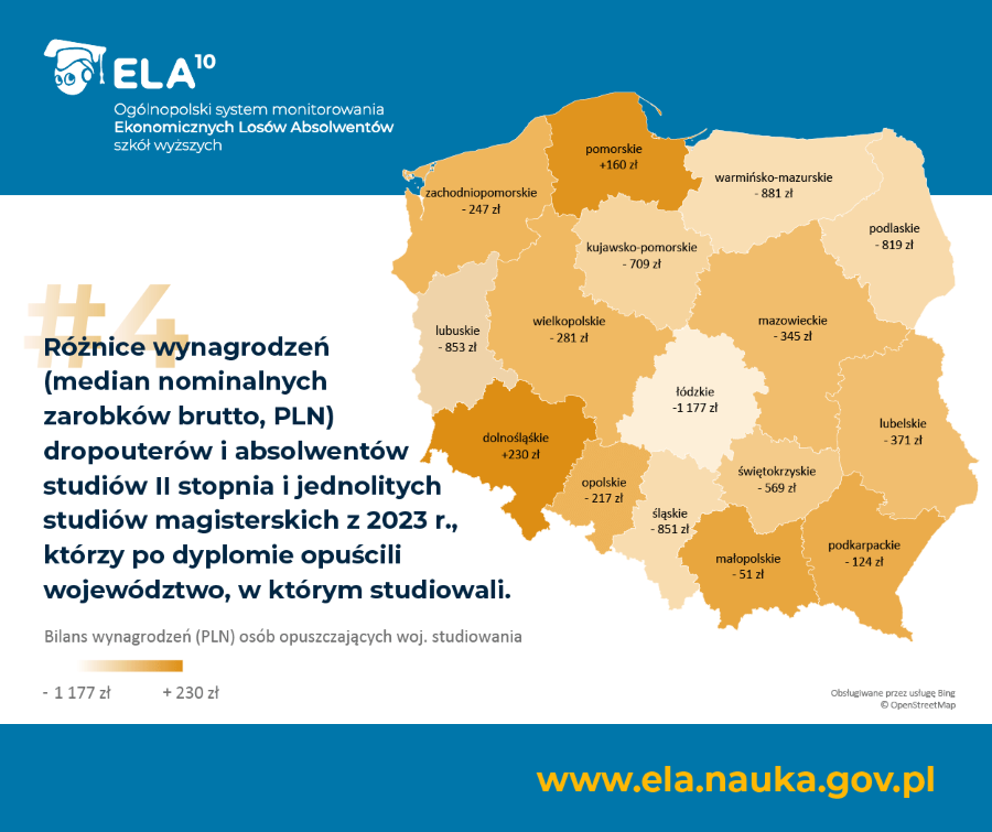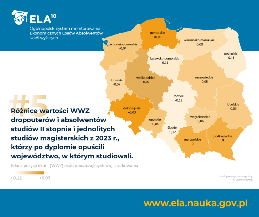 Jesienna odsłona dziesiątej edycji Ogólnopolskiego systemu monitorowania Ekonomicznych Losów Absolwentów szkół wyższych została rozszerzona o nowe dane. Eksperci z Ośrodka Przetwarzania Informacji – Państwowego Instytutu Badawczego (OPI PIB) dodali dane dotyczące zmian miejsca zamieszkania osób porzucających studia oraz podejmowanych przez nie aktywności zawodowych w poszczególnych województwach. Warto podkreślić, że nowe wyniki ELA, dotyczące ekonomicznych aspektów mobilności przestrzennej dropouterów, ukazują jeszcze dobitniej skalę strat wynikających z porzucenia kształcenia bez uzyskania dyplomu.